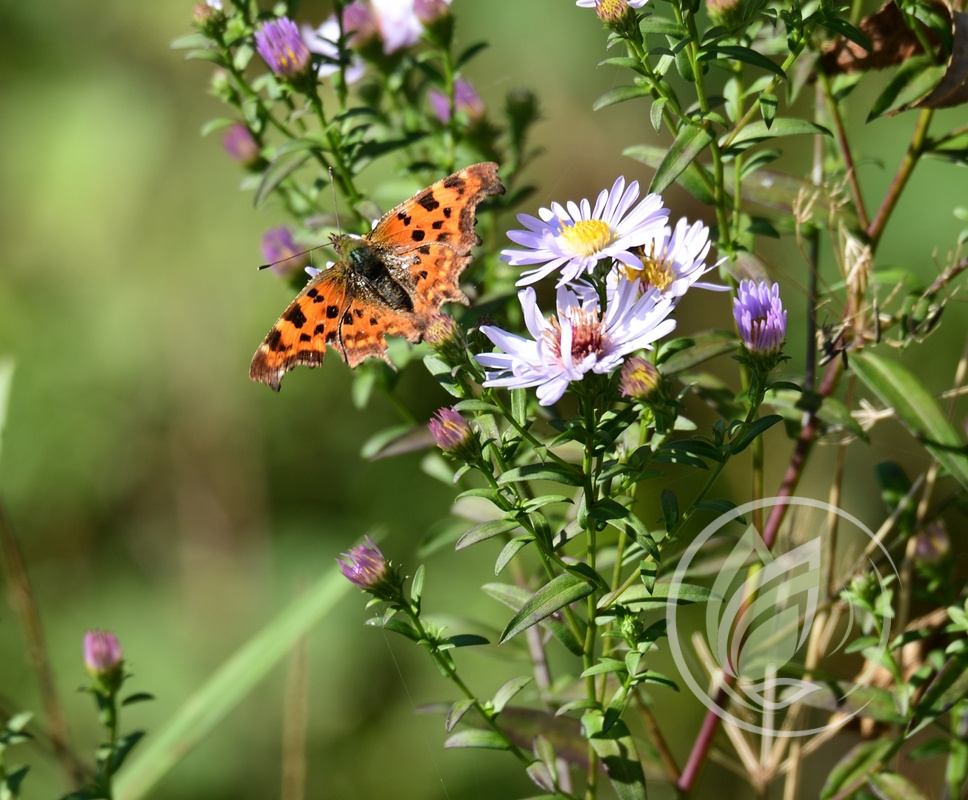Polygonia c-album, the comma, is a food generalist (polyphagous) butterfly species belonging to the family Nymphalidae. The angular notches on the edges of the forewings are characteristic of the genus Polygonia, which is why species in the genus are commonly referred to as anglewing butterflies. Comma butterflies can be identified by their prominent orange and dark brown/black dorsal wings.
