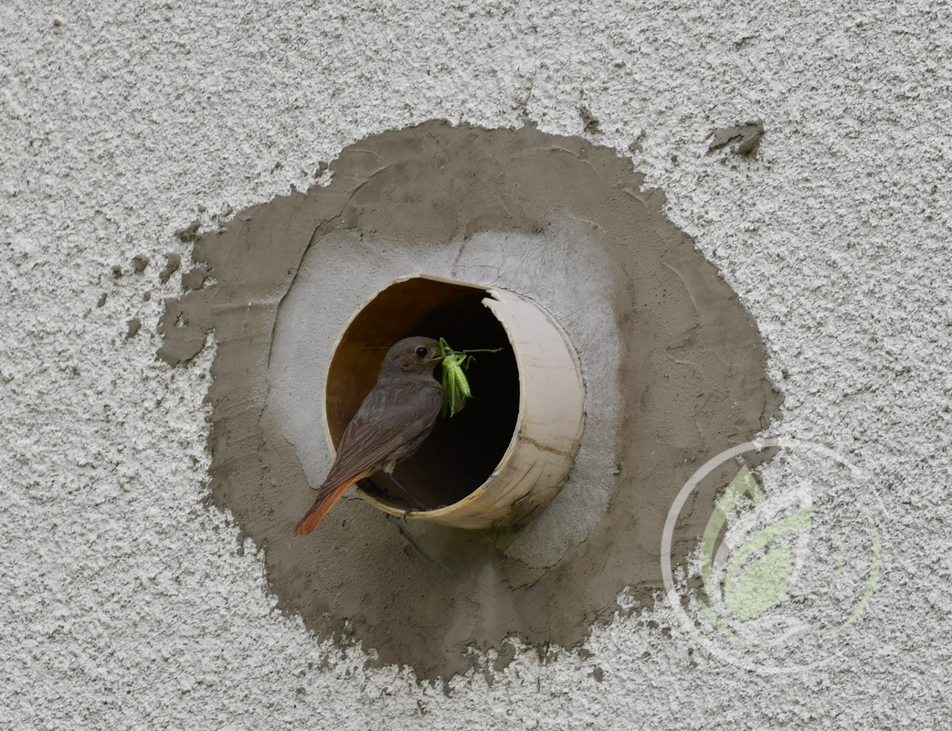 This is Immature European black redstart . The black redstart (Phoenicurus ochruros) is a small passerine bird in the redstart genus Phoenicurus. Like its relatives, it was formerly classed as a member of the thrush family (Turdidae), but is now known to be an Old World flycatcher (Muscicapidae). Other common names are Tithy's redstart, blackstart and black redtail. The black redstart is 13–14.5 cm (5.1–5.7 in) in length and 12–20 g (0.42–0.71 oz) in weight, similar to the common redstart. The adult male is overall dark grey to black on the upperparts and with a black breast; the lower rump and tail are orange-red, with the two central tail feathers dark red-brown. The belly and undertail are either blackish-grey (western subspecies; see Taxonomy and systematics, above) or orange-red (eastern subspecies); the wings are blackish-grey with pale fringes on the secondaries forming a whitish panel (western subspecies) or all blackish (eastern subspecies). The female is grey (western subspecies) to grey-brown (eastern subspecies) overall except for the orange-red lower rump and tail, greyer than the common redstart; at any age the grey axillaries and underwing coverts are also distinctive (in the common redstart these are buff to orange-red). One-year-old males are similar to females but blacker; the whitish wing panel of the western subspecies does not develop until the second year.