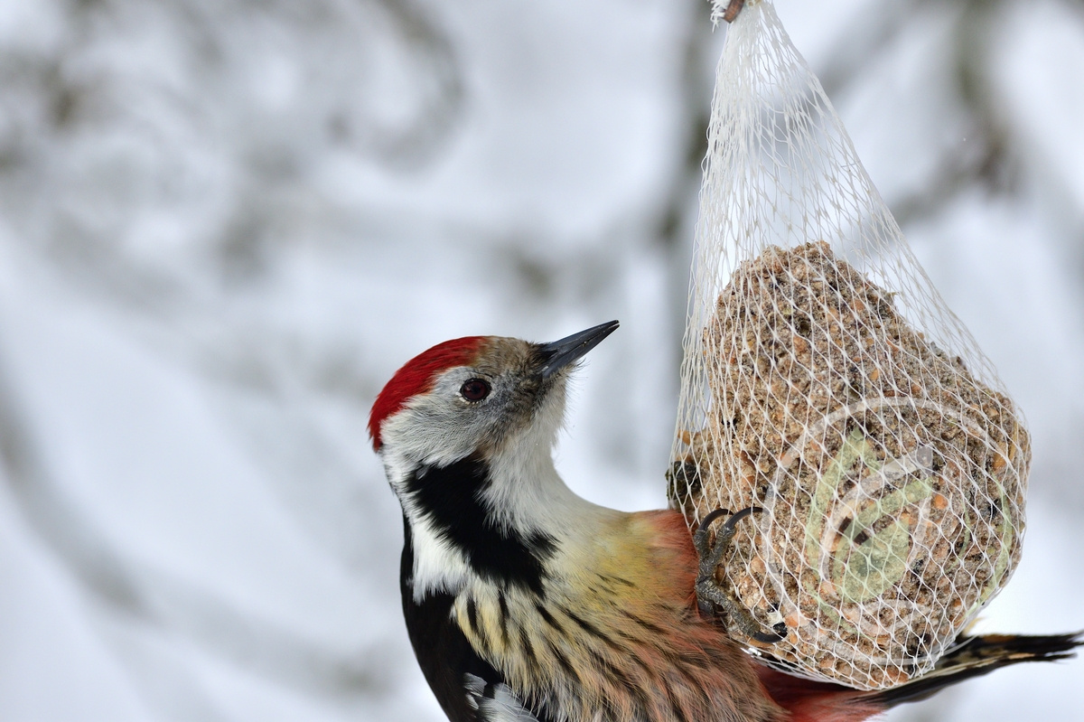The middle spotted woodpecker lives predominantly on a diet of insects as well as their larvae, which it finds by picking them from branches and twigs rather than hacking them from beneath the bark. It will also feed on tree sap. It is rarely heard drumming, and never for territorial purposes, which it asserts by song; a slow, nasal gvayk gvayk gvayk gvayk gvayk. Calls include a fast kik kekekekek.