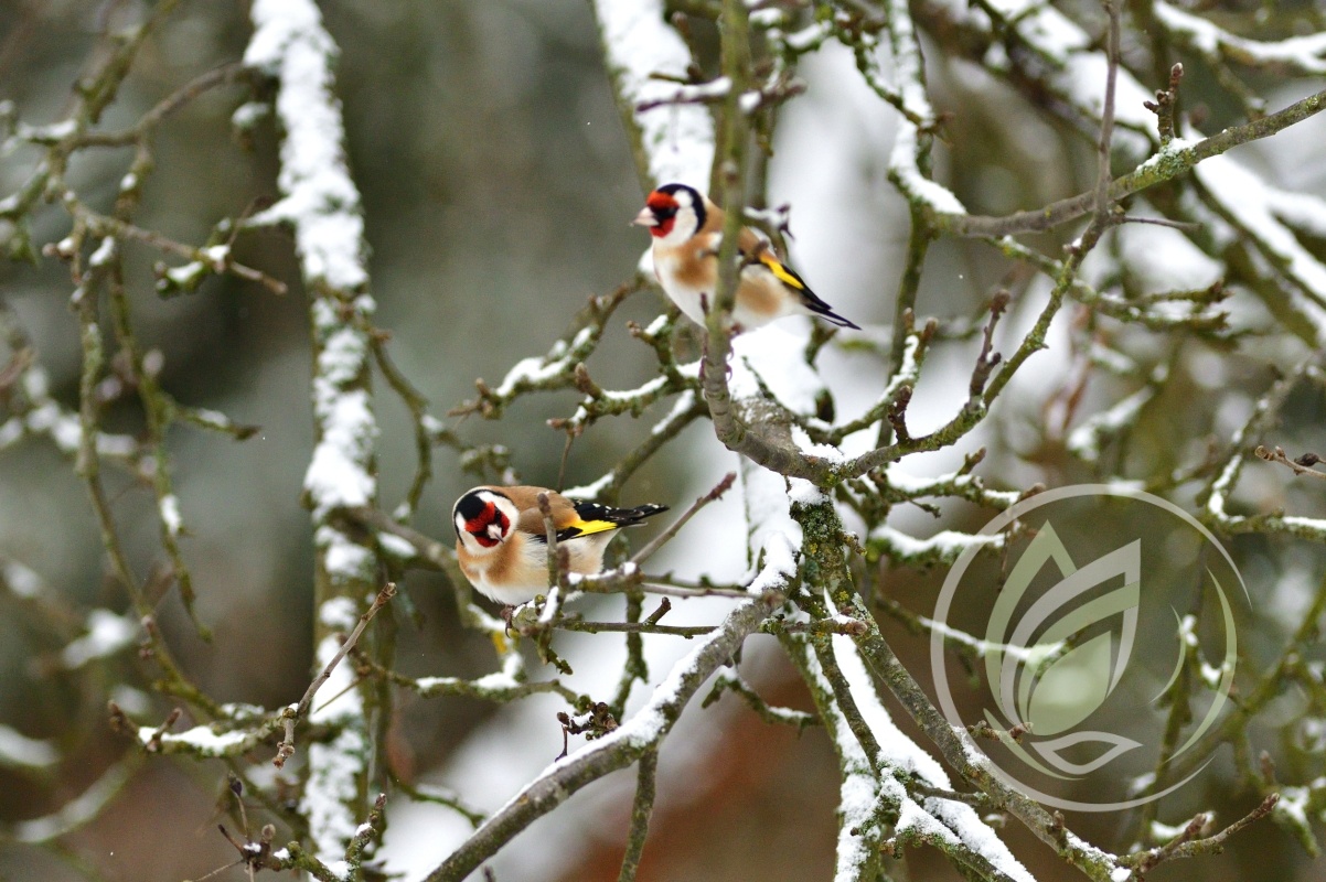 The goldfinch's preferred food is small seeds such as those from thistles (the Latin name is from Carduus, a genus of thistles) and teasels, but insects are also taken when feeding young. It also regularly visits bird feeders in winter. In the winter goldfinches group together to form flocks of up to 40, occasionally more. Goldfinches are attracted to back gardens in Europe and North America by birdfeeders containing niger (commercially described as nyjer) seed. This seed of an annual from Africa is small, and high in oils. Special polycarbonate feeders with small oval slits at which the goldfinches feed are sometimes used.