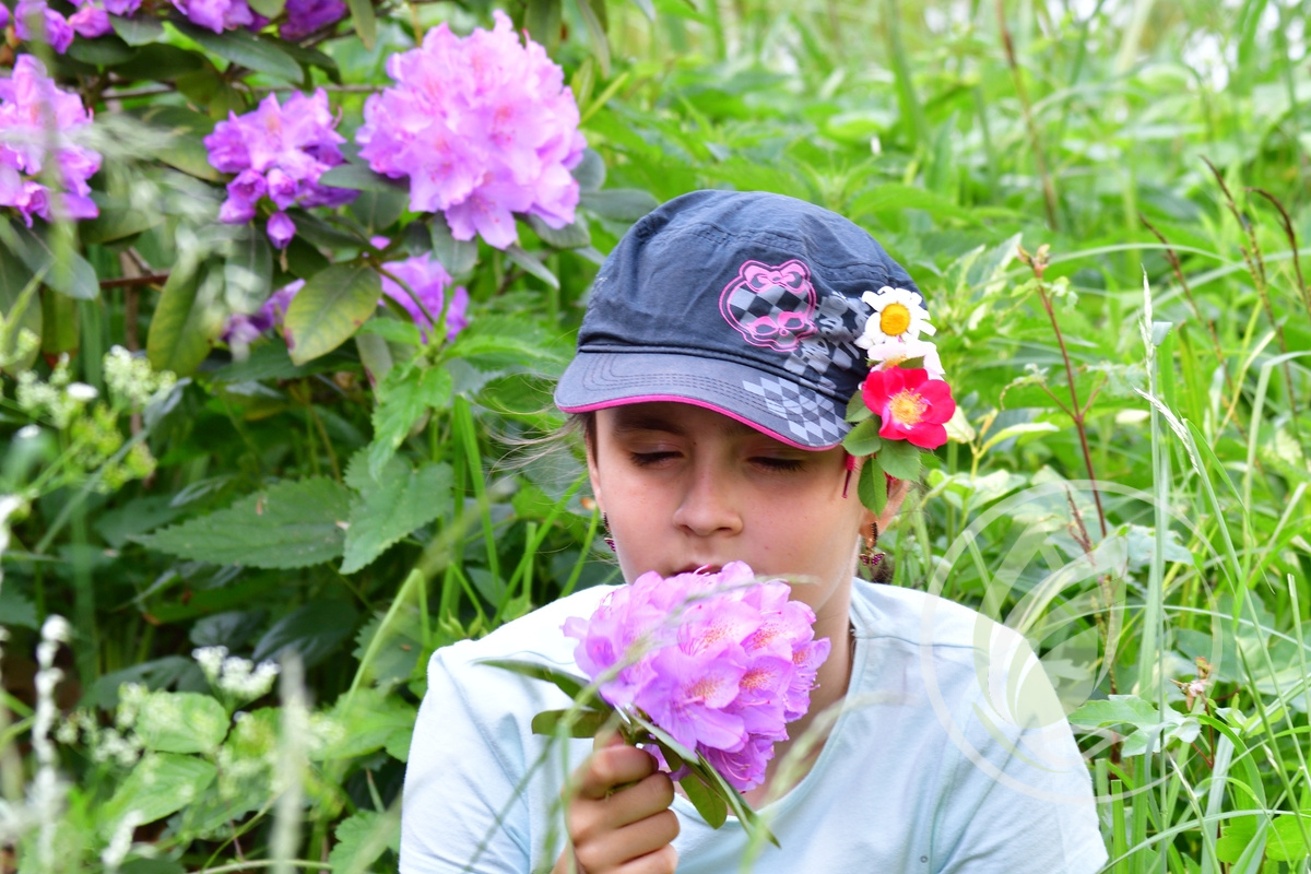 Dievča s kvetmi okolo hlavy.